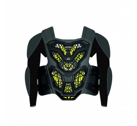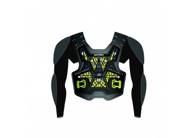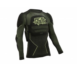 El diseño innovador combina la ligereza/ventilación de un peto cruzado y la protección de un chaleco protector: las protecciones de hombros y codos se montan en las mangas de tejido elástico perforado, diseñadas para garantizar una elevada transpirabilidad y adherencia en los brazos. Las mangas se fijan a las correas acolchadas del protector de espalda, permitiendo así que la cadera esté libre de tejido para aumentar la transferencia de temperatura y la transpirabilidad